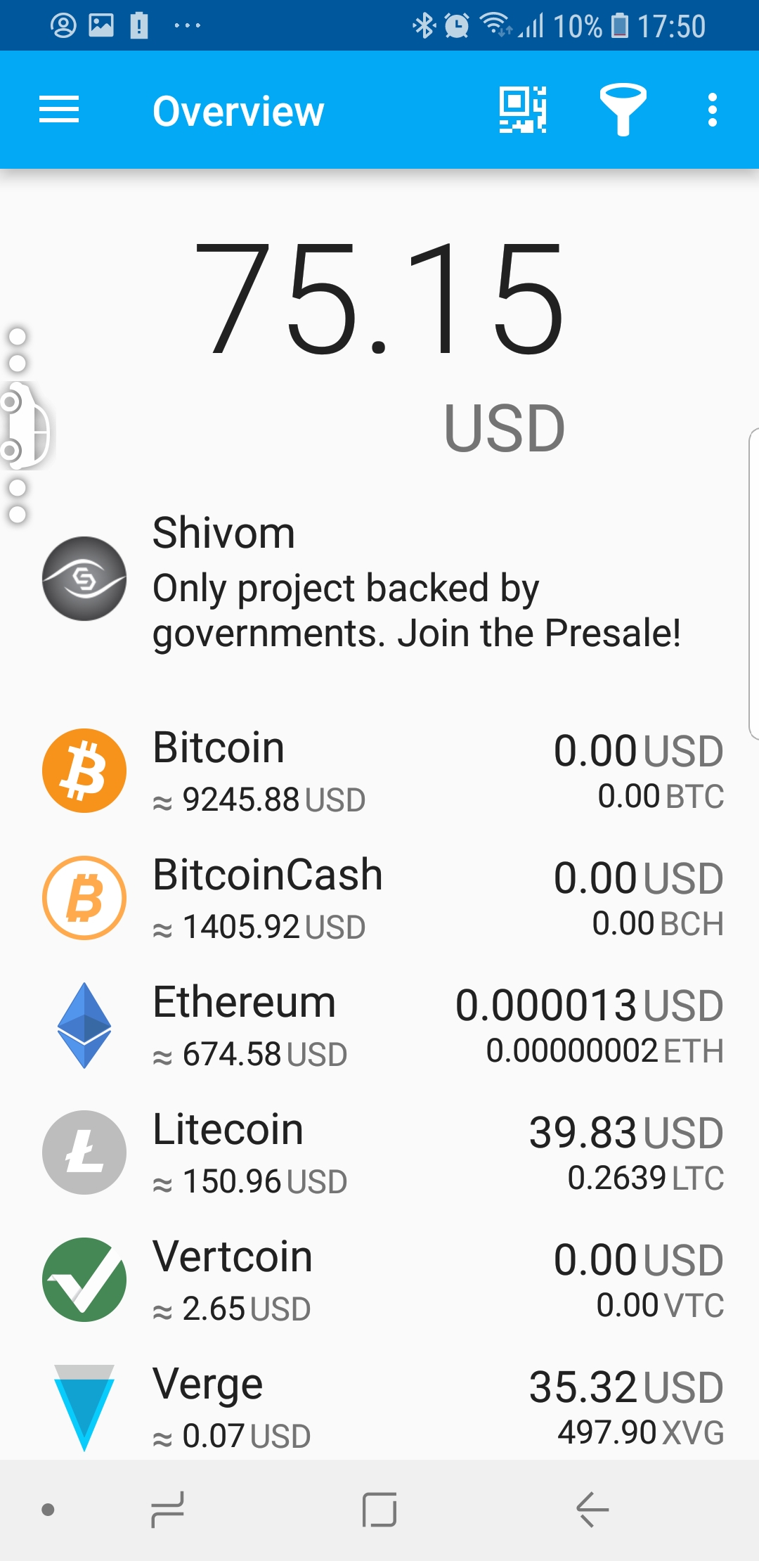 Morali biste ih vidjeti na početnom ekranu na kojem će također biti i iznos u fiat valuti (dolarima ili eurima) koju ste odabrali na Coinomi novčaniku.