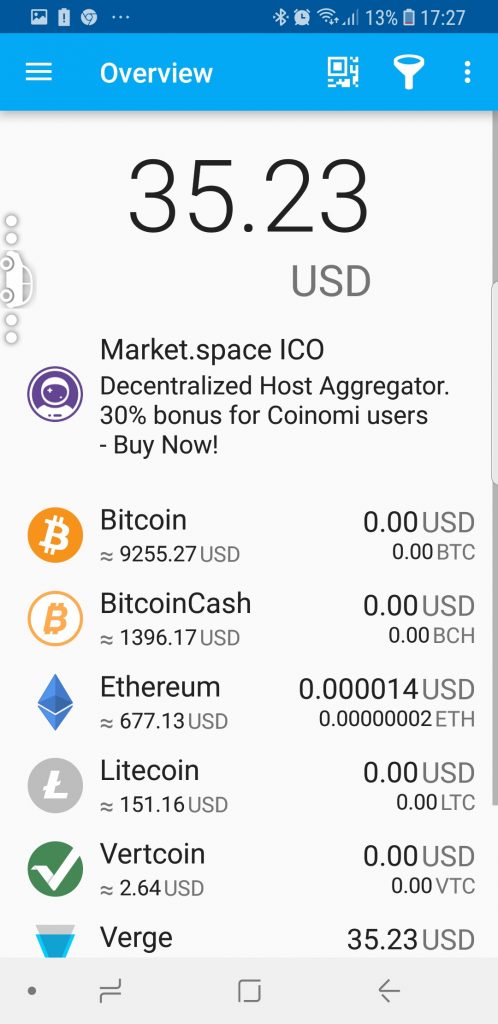 Pričekajte neko vrijeme, recimo pola minute ili minutu. Na ekranu Coinbase i dalje će stajati „pending“ uz vašu transakciju, ali vi se već možete vratiti svom mobitelu. Pokrenite Coinomi novčanik i pogledajte…