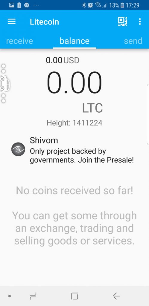 Pokrenite Coinomi novčanik na svom pametnom telefonu. Pokazat će vam se početna stranica s popisom kriptovaluta koje ste odabrali. Uz sve njih će biti nula jer još uvijek nemate kriptosredstava. I na slici u primjeru Litecoini su na nuli.