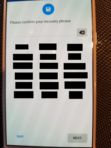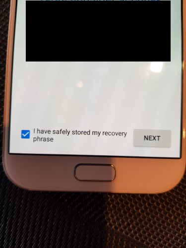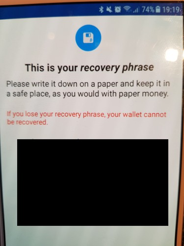 „Recovery phrase“ je na slici sakrivena iza crnog kvadrata. Na vašem će ekranu biti lista od 18 engleskih riječi.