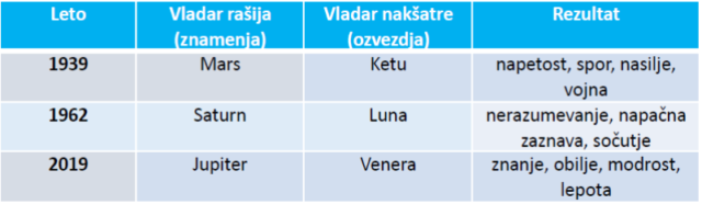 Tisti, ki poznate džotiš ali astrologijo na sploh, ste že iz preglednice lahko razbrali, zakaj se je leto 1939 izteklo slabše kot leto 1962. Kombinacija vladarjev Marsa in Ketuja ni nakazovala na nič drugega kot na vojno. Po drugi strani pa kombinacija vladarjev Saturna in Lune najprej pokaže na živčnost, napetost, nerazumevanje in zamegljeno zaznavo, šele potem na možno destrukcijo.