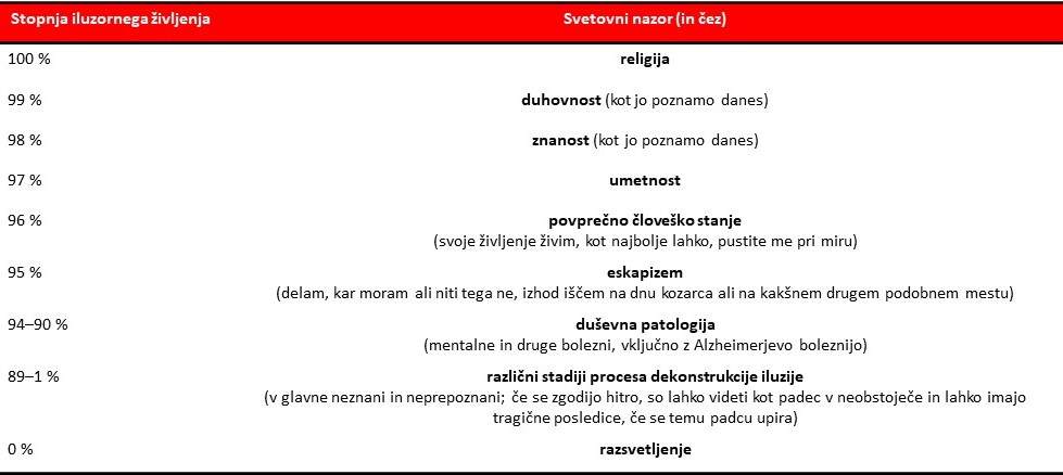 V začetnih poglavjih knjige »Preboj – zoperstavite se avtoriteti iluzije« sem predstavil količino iluzije v življenju povprečnega človeka in pokazal, da okoli 96 % njegovega življenja pripada iluziji. Morda to ni niti presenečenje, a to, kar je bralce, ki iščejo duhovne rešitve, presenetilo, je trditev, da pri njih količina iluzije v življenju naraste! Tako nekdanji prevladujoči »iluzionist«, ki se prepusti trenutnim informacijam in znanju z duhovnega področja, na enkrat poskoči na 99 % iluzije! Če postane del religije, ima celo možnost, da iz svojega življenja resnico popolnoma izbriše in da živi v 100% iluziji.
